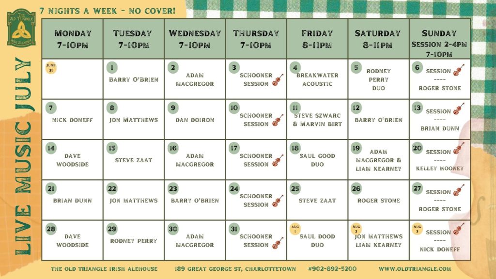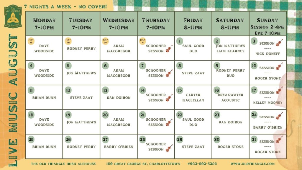 Shown below is the upcoming entertainment at The Old Triangle Irish Alehouse in Charlottetown, PEI. If you have any questions please contact us at charlottetown@oldtriangle.com.